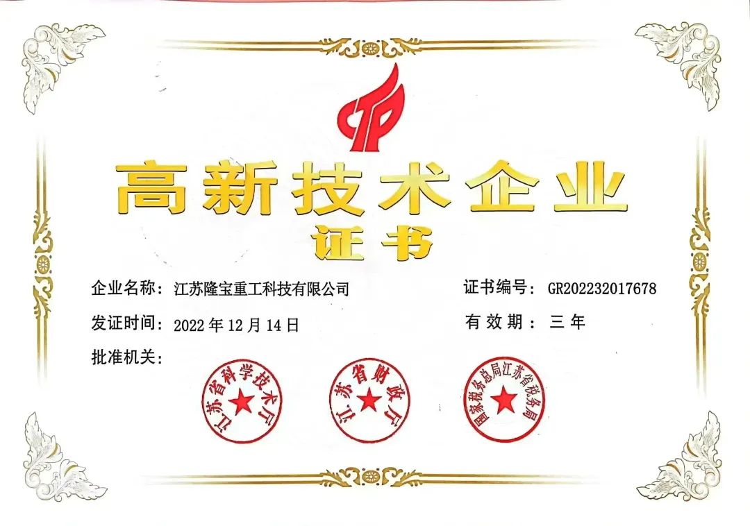 喜報(bào)!!!丨江蘇隆寶重工科技有限公司獲得高新技術(shù)企業(yè)證書(shū)